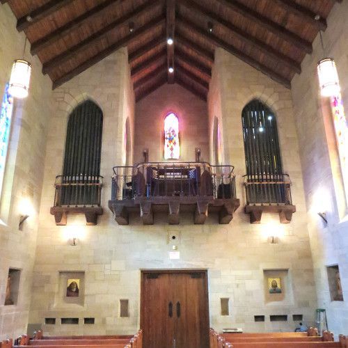 The chapel organ was built in 1935 by Casavant Frères of Sainte-Hyacinthe, Québec. The instrument is the firm's opus 1506, and consists of 29 ranks of pipes. The main organ and console are in the rear gallery, and there is a small echo organ above and to the left of the crucifix. The original specifcation can be found here. Several tonal changes have been made since the instrument's original installation.