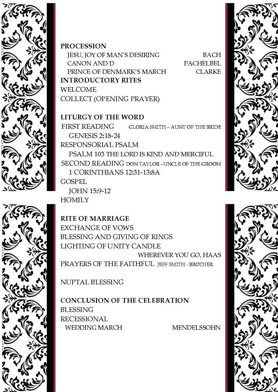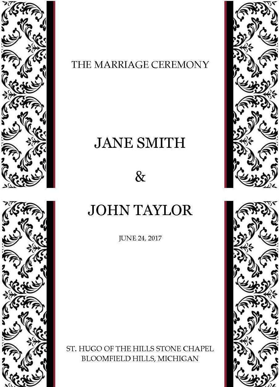 Below is a template you may use for your wedding program when you are celebrating your marriage without Mass (Catholic and non-Catholic baptized, or Catholic and unbaptized). Use your "Together for Life" booklet that the priest has given you to help reference your selections (see italicized examples below). You should wait to write your program until after you have met with the priest to plan your liturgy. You can then use the choices you have made from the selection form in the "Together for Life" booklet to put your program together. You can also use the selections from the wedding music form to fill in your musical choices. Again, you will want to speak with the music department at St. Hugo ahead of finishing your program.